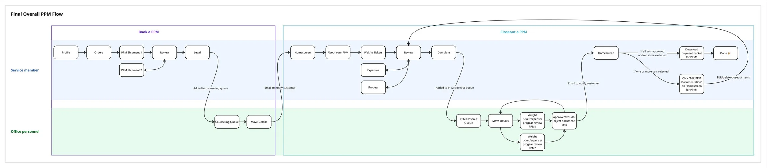 After some initial discovery work with my product team, we realized that PPMs were by far the most complicated move type that we had yet to tackle on the project. As compared to other move types, PPMs required customers to interact with them multiple times throughout their lifecycle so we decided to break up the work into two parts: booking a PPM and closing out a PPM.